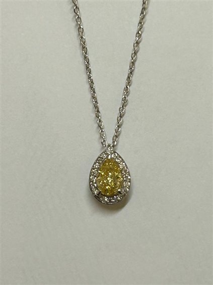 Girocollo realizzato in oro bianco riciclato 18 KT con incastonato 1 diamante Lab Grown taglio goccia di colore Fancy Intense Yellow da 0,53 ct e 22 diamanti Lab grown taglio brillante per un totale di 0,08 ct