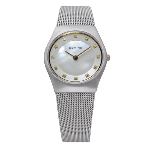 Orologio solo tempo da donna di Bering della collezione Classic. in acciaio del diametro di Mm. 27. Cinturino in acciaio maglia Milano con chiusura a scatto. Quadrante bianco con indici dorati, pietre Swarovski , vetro zaffiro. Movimento al quarzo, resistenza all'acqua di 5 Atm.