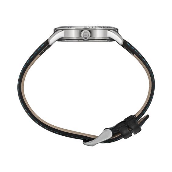 L'orologio solo tempo Mate è perfetto per i giovani sportivi che amano il colore. In questa versione il contrasto tra nero e azzurro è esaltato da scelte stilistiche ben precise: il cinturino nero con texture effetto fibra di carbonio è decorato da impunture azzurre. Stesso accostamento sul quadrante nero, che è reso più eccentrico da una porzione di rehaut e dalla sfera dei secondi azzurri. Un orologio perfetto per ogni occasione.