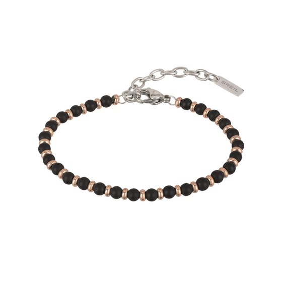In acciao lucido IP rose. Sfere in acciaio IP rose e onice nera opaca. Chiusura a moschettone.