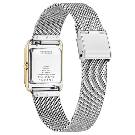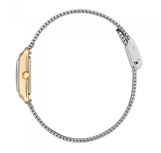 Orologio donna solo tempo modello LADY. Cassa rettangolare curva 21,5 x 29 mm.in acciaio lucido bicolore. Vetro curvo zaffiro inscalfibile ad esaltare il quadrante in madreperla. Movimento Eco Drive a carica luce infinita con riserva di carica di sei mesi. Bracciale maglia Milano in acciaio regolabile con sistema di sgancio rapido per la sostituzione con un cinturino in Ecopet in omaggio.