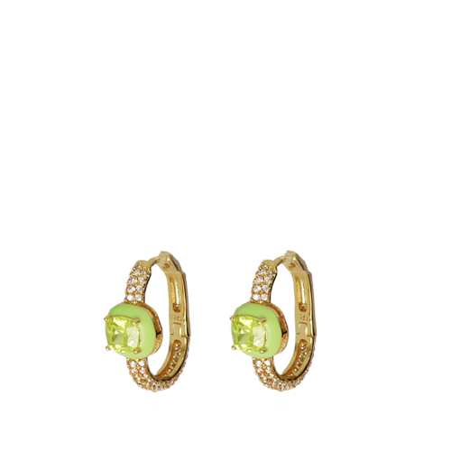 Orecchini a cerchio con zircone centrale di colore verde contornato da smalti color verde mela e pietre bianche
