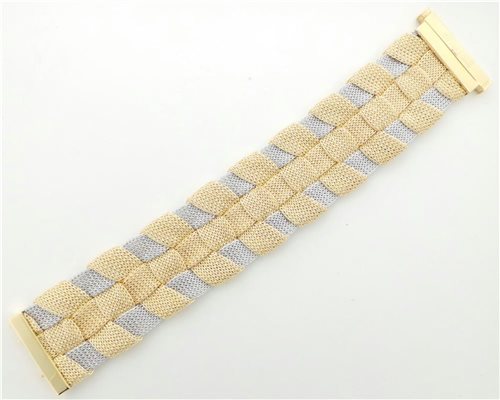 Bracciale donna in argento e lurex , maglia intrecciata dorata e bianca , chiusura dorata con bottoni laterali , lunghezza cm 18. Immagine indicativa , la confezione può variare in forma e colore.