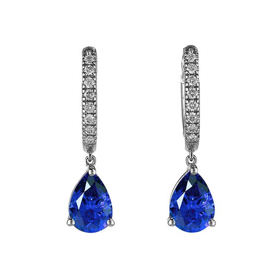 Paio di orecchini in oro bianco 18 KT con 2 zaffiri naturali di taglio a goccia misura 7X5 mm ct. 1,49 e 16 diamanti bianchi qualità G-Si da 0.007 ct per una caratura totale di 0.11 ct