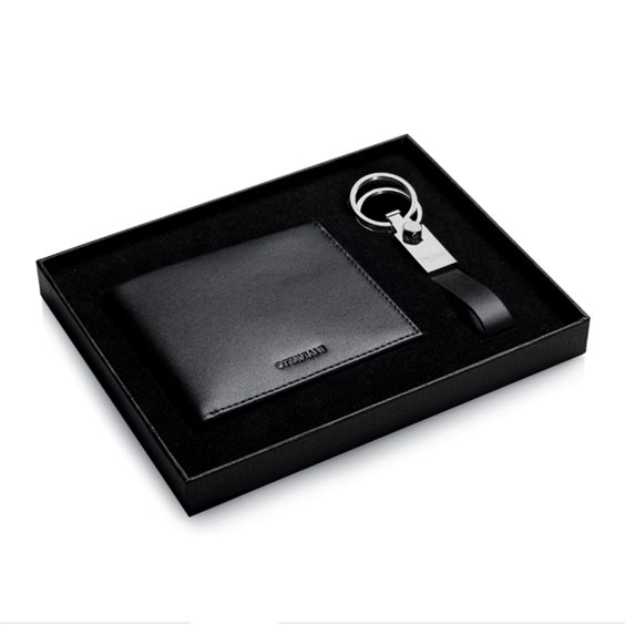 Portachiavi in acciaio e pelle e portafoglio in pelle ideati e realizzati da Ottaviani, la lunghezza della penna è di 14 centimetri, il portafoglio ha 10 scomparti, misure 9x11x1,5 centimetri.