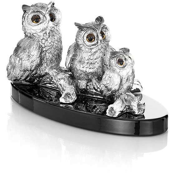 Scultura Di Ottaviani Della Linea Home. Scultura "Tre Gufetti" in resina rivestita In Argento Su Base In Legno Laccato Nero. Dimensioni:18,5 x 9 h. 9 cm