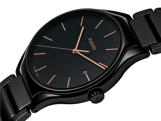 Cassa e bracciale in ceramica high-tech nera. Fixata lunetta in ceramica nera. Quadrante nero con lancette in oro rosa e indici indici. Tipo di quadrante: analogico. Visualizzazione della data nella posizione ore 3. Movimento al quarzo. Vetro zaffiro antigraffio. Tirare / spingere la corona. Fondello solido. Dimensione della cassa: 40 mm. Spessore cassa: 8,9 mm. Forma della cassa rotonda. Larghezza della fascia: 20 mm. Chiusura deployante. Resistente all'acqua a 50 metri / 165 piedi. Funzioni: data, ora, minuti, secondi. Stile orologio da sera.