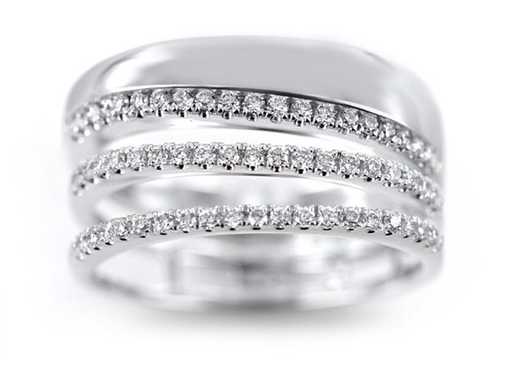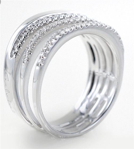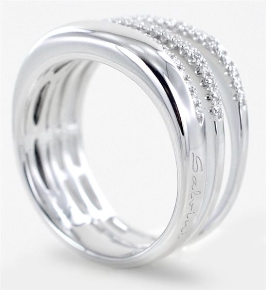 Anello di Salvini Gioielli realizzato a tripla fascia in oro con diamanti naturali, la fascia più larga in oro bianco misua 5.00 mm li larghezza e la larghezza totale dell'anello èdi 10.00 mm. l'anello è a finitura lucida ed all'esterno del gambo riporta il marchio Salvini. oro bianco 18 kt - 750/000 diamanti naturali, taglio brilante rotondo, per carati totali 0.30, colore G Gioielli Salvini in oro e diamanti corredati da scatola e certificato di garanzia e autenticità Salvini Gioielli