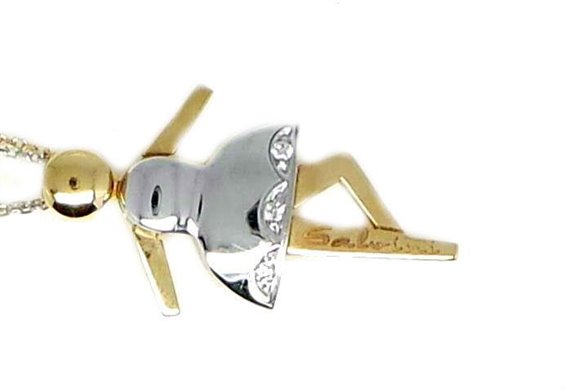 SALVINI collezione ballerine dimensione + grande in oro bicolore bianco e rosa 750% (18 ct) con doppia catena bicolore. diamanti taglio brillante ct 0.02 colore H purezza IF dimensione ciondolo cm 2,5 x 1,3 Ogni gioiello Salvini è accompagnato da assicurazione gratuita contro rischi di furto e rapina per tre anni.