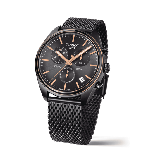 Orologio Cronografo. Cassa in acciaio 316L con trattamento in PVD nero opaco-lunetta oro rosa e nera lucida- corona e pulsanti lucidi- Ø 41mm. spessore 10,71 mm - ansa 20mm. Movimento Swiss made Crono Quartz ETA G 10.211 : ora minuti secondi data, contatori crono 1/10sec.- 30min.- secondi crono al centro. Vetro zaffiro antigraffio. Quadrante nero index e lancette colore oro rosa lucide e luminor. Bracciale regolabile in maglia milanese in acciaio con trattamento PVD nero opaco con chiusura di sicurezza. Impermeabile 100 metri( 10 bar ). Peso 115 grammi.Garanzia 2 anni.