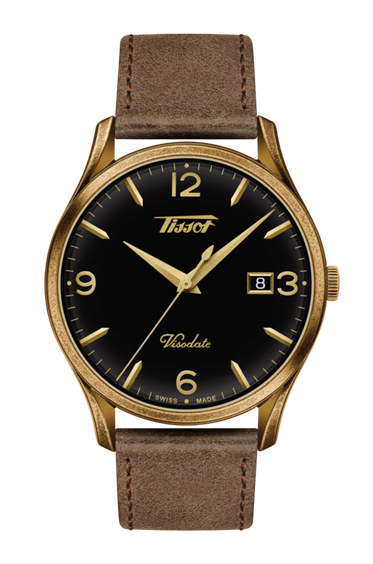 Orologio solo tempo. Cassa in acciaio 316L con trattamento PVD color bronzo 40 mm. spessore 10,7 mm. ansa 20 mm. Movimento al quarzo Swiss Made ETA F06.111 : ore minuti secondi al centro data. Vetro zaffiro bombato antigraffio. Quadrante nero indici e lancette lucide . Cinturino in pelle marrone . Impermeabile 30 metri (3 bar). Peso 52 grammi. Fedele allo stile della collezione Visodate originale, questa nuova versione al quarzo si rivolge al pubblico più giovane che ricerca un'impronta vintage. Nel quadrante ritroviamo il logo storico di Tissot e il datario, caratteristica che ispirò il nome di questa collezione ripreso a ore 6.