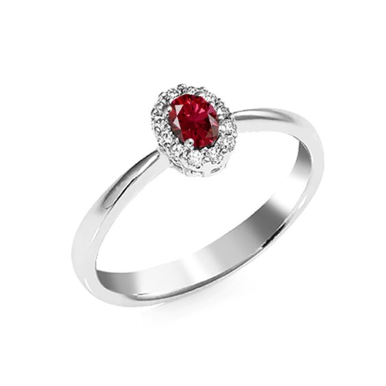 Anello in oro bianco 750/000 con rubino naturale a taglio ovale misura 4X3 mm ct. 0,20 e diamanti bianchi qualità G-Si per una caratura totale di 0.09 ct