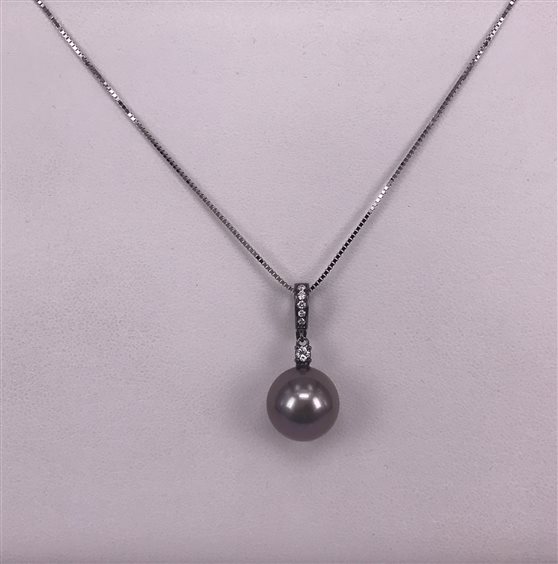 Collana veneziana in oro bianco 750/000 con ciondolo in oro bianco 750/000 brunito e perla coltivata Akoya di colore grigio scuro e diamanti taglio brillanti ct. 0,10