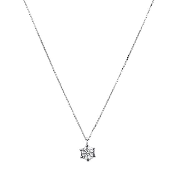 Girocollo con ciondolo onda a sei punte in oro bianco 18 KT con 1 diamante taglio brillante qualità G-Si da 0.22 ct con catena veneziana da 1,30 gr