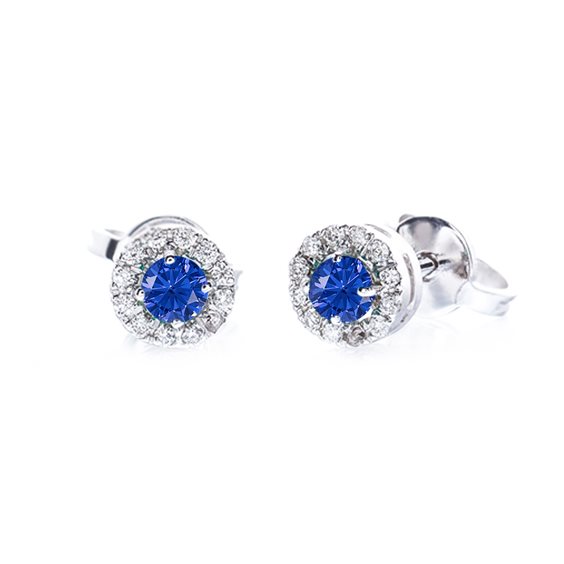 Paio di orecchini in oro bianco 750/00 con zaffiri naturali a taglio rotondo da 0.21 ct e 24 diamanti bianchi qualità G-Si per una caratura totale di 0.10 ct