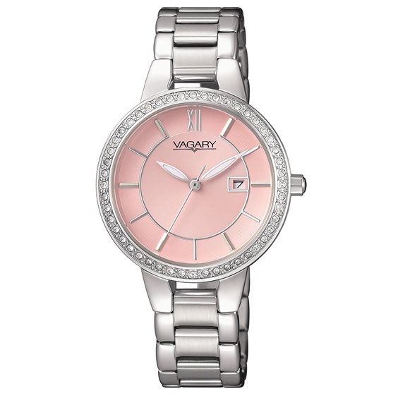 Cassa in acciaio con 48 cristalli sulla lunetta. Bracciale acciaio. Vetro minerale. WR 5 bar.